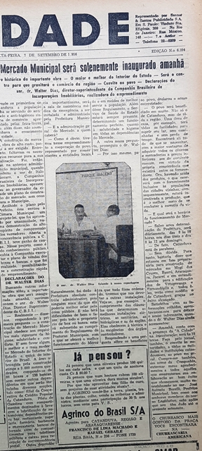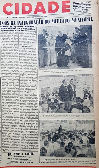 08.09.1956 – Nesse dia foi inaugurado o Mercado Municipal da Rua Maranhão, esquina com a Avenida São Domingos, área de 3.000 m2, com 80 boxes e 130 bancas. A corte da fita simbólica foi feita por Padre Albino, a construção foi iniciada na gestão do Prefeito Municipal Ítalo Záccaro e inaugurado pelo prefeito José Antônio Borelli. Presença de autoridades, vereadores e do deputado Antônio Mastrocola. A construção foi feita pelo Dr. Walter Dias, proprietário da Cia. Brasileira de Incorporações Imobiliárias. Matéria do Jornal “A Cidade” e fotos do arquivo da família do Sr. Francisco de Lima Machado.